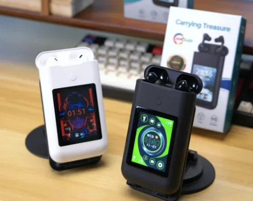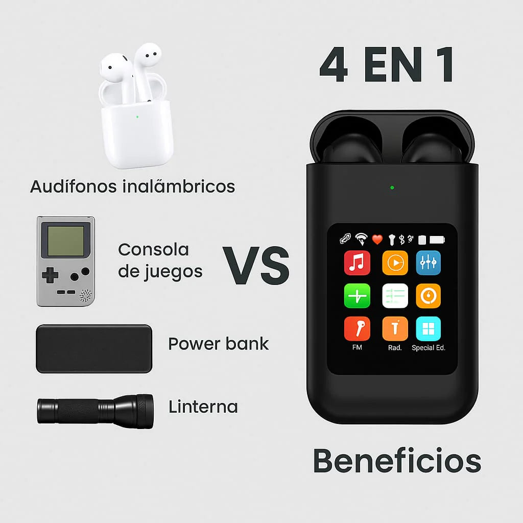 Lleva tu experiencia multimedia al siguiente nivel con este innovador dispositivo todo-en-uno que combina:Auriculares Bluetooth deportivos con sonido Hi-Fi y cancelación de ruido. Pantalla táctil a color de 2.8”para controlar música, juegos y más. Power Bank de 8000 mAh para mantener tu smartphone y gadgets siempre cargados.