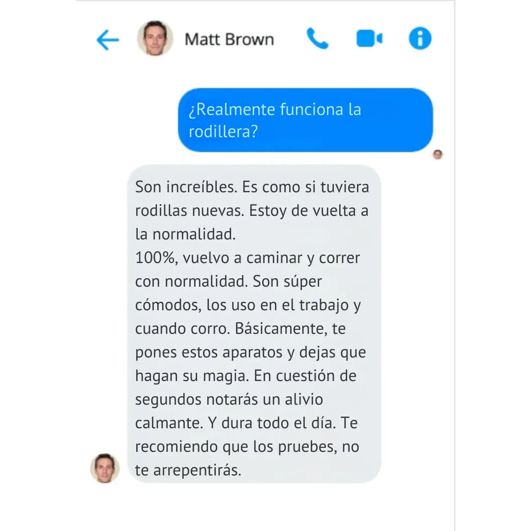 "Cuando me desperté a la mañana siguiente, vi un mensaje de un viejo amigo. Me contaba que había tenido dolor de rodilla durante años, pero que después de gastar decenas de miles de dólares viajando por el mundo para visitar a los mejores fisioterapeutas, finalmente encontró uno que le recomendó un nuevo tipo de aparato ortopédico llamado KneeGuard Pro™