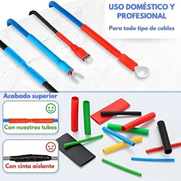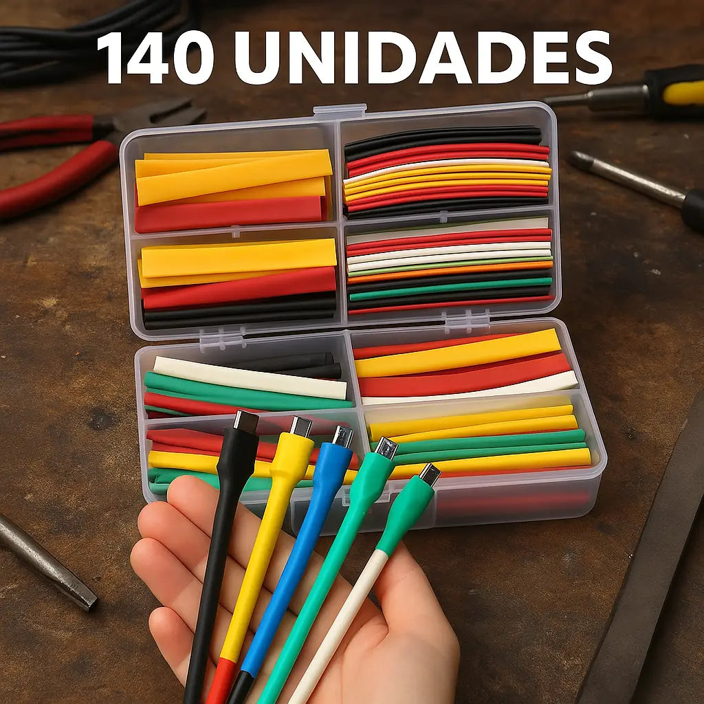 Es un kit completo de 140 tubos protectores que se ajustan con calor, ideales para proteger, cubrir y mejorar cualquier tipo de cable que tengas en casa, el auto o el taller.