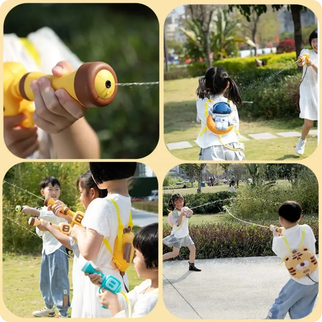 Cada mochila tiene un tanque de agua fácil de llenar y una pistola que es perfecta para manos pequeñas. ¿Lo mejor? Los colores vibrantes y los diseños atractivos les encantarán a los niños 👧👦🎉