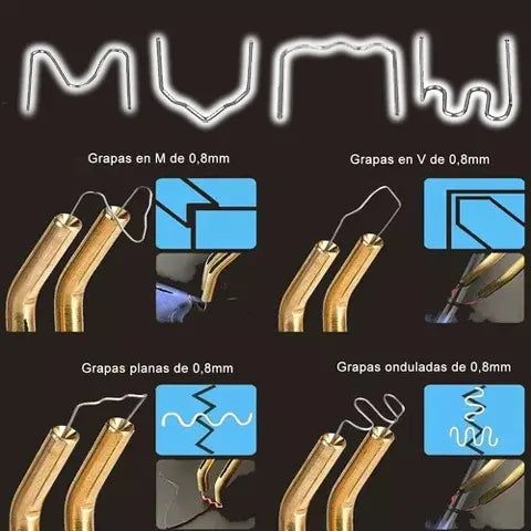 La grapa en forma de V para esquina interiores, la grapa en forma de M para esquinas exteriores, otras dos grapas para superficie plana. Se adapta a tus necesidades.