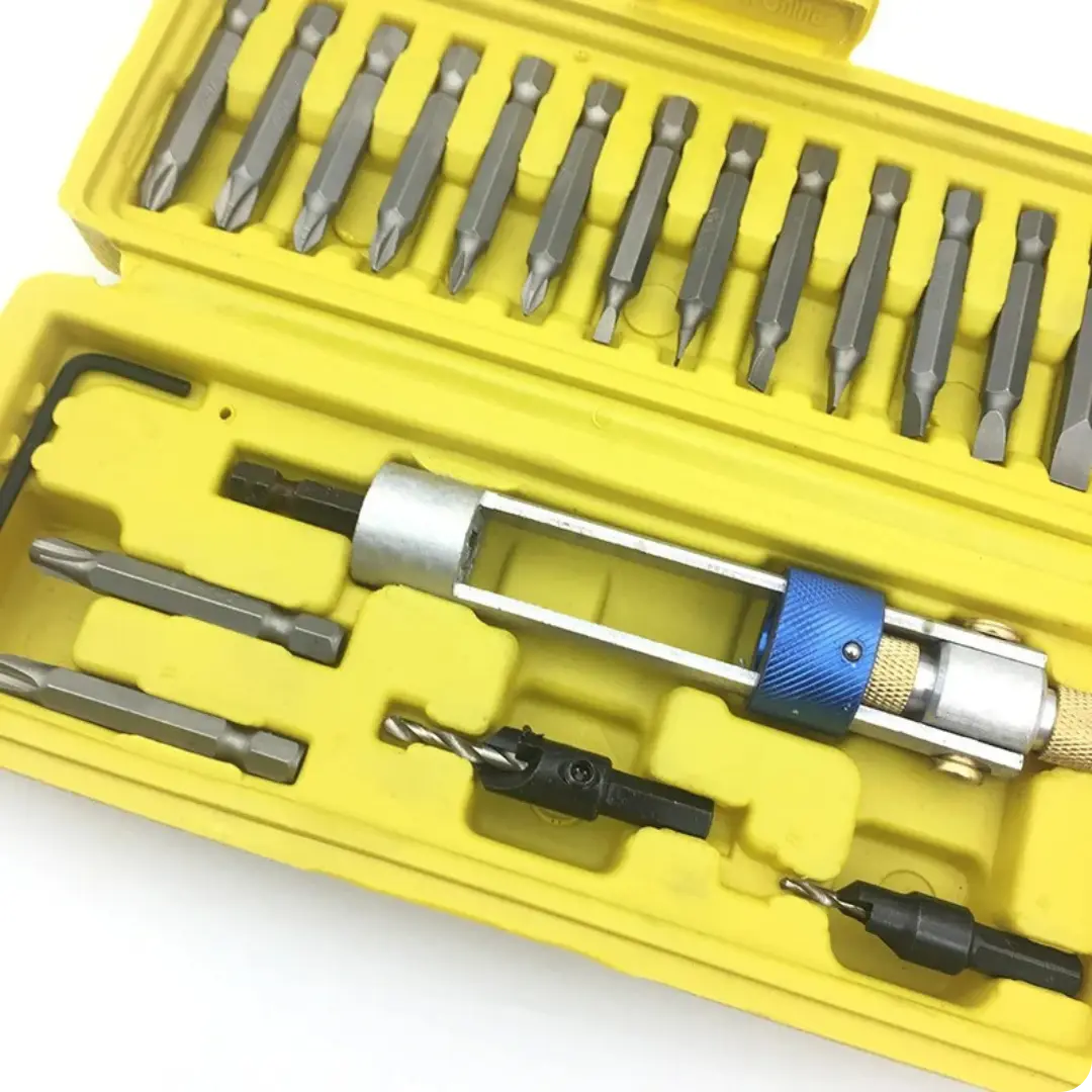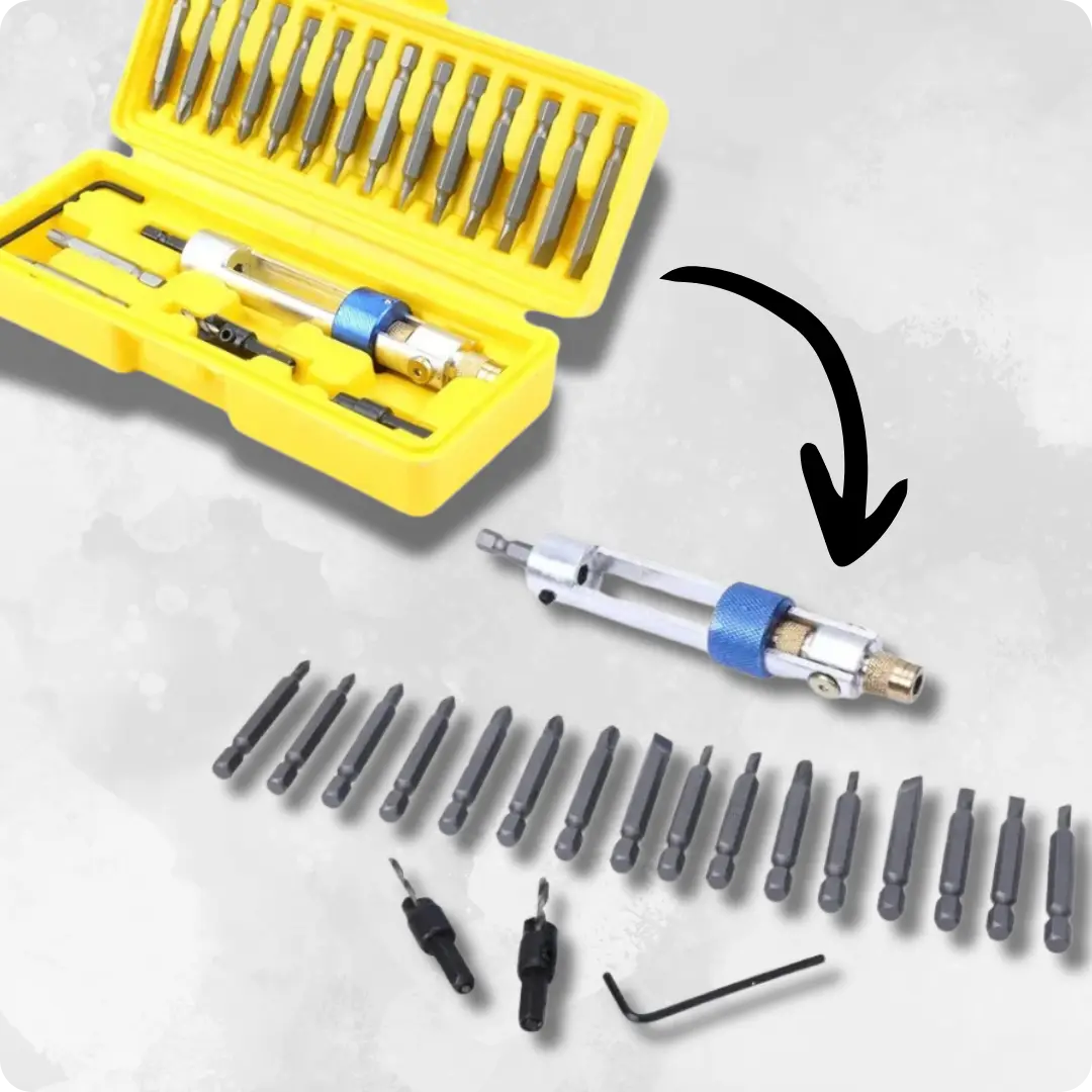 ☑️Este set compacto y portátil incluye todo lo necesario para taladrar, atornillar y avellanar con precisión.