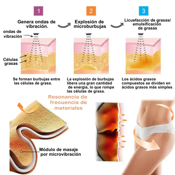 El material de masaje en el short moldeador usa microvibraciones de baja frecuencia, que se activan con el movimiento, imitando un masaje manual. Estas vibraciones descomponen la grasa, activan el metabolismo, promueven la desintoxicación linfática y ayudan a la regeneración muscular. También mejoran la circulación y reducen la tensión muscular y la celulitis.